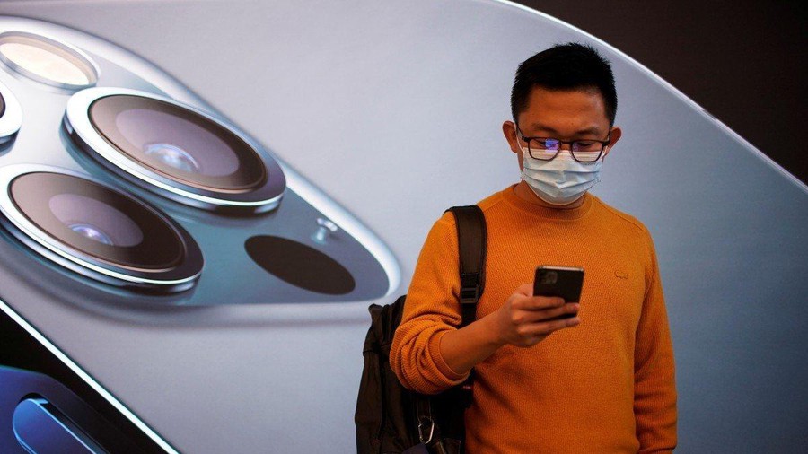 Người đàn ông đeo khẩu trang chờ mua iPhone 12 5G tại Thượng Hải, Trung Quốc hôm 23/10. Ảnh: Reuters