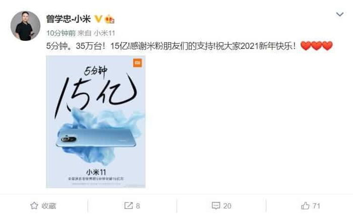 Thông tin này được tiết lộ bởi Zeng Xuezhong, Phó Chủ tịch Tập đoàn Xiaomi kiêm Chủ tịch bộ phận điện thoại di động. Vị này xác nhận Xiaomi đã đạt cột mốc ấn tượng, khi bán được 350.000 chiếc Mi 11 chỉ sau 5 phút mở bán. Đó là một cột mốc ấn tượng, nhưng đó không phải là một bất ngờ lớn nếu bạn đã theo dõi Xiaomi trong một vài năm nay. Đặc biệt là do trên thực tế, Mi 11 có sức hút rất lớn khi là điện thoại thông minh đầu tiên chạy chip Snapdragon 888 và là chiếc flagship đầu tiên của năm 2021.
