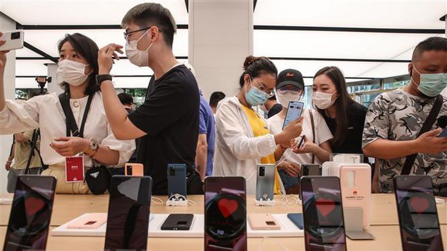 Điện thoại thông minh của Huawei được bày bán tại một cửa hàng ở Thượng Hải, Trung Quốc ngày 23/6/2020. (Nguồn: AFP/TTXVN)