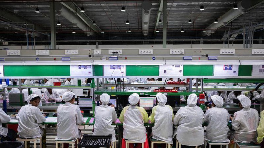 Nhân viên kiểm tra điện thoại tại Rising Stars Mobile India, một công ty con của Foxconn ở Sriperumbudur, Ấn Độ năm 2019. Ảnh: Bloomberg