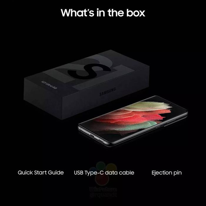 Theo thông tin rò rỉ được trang WinFuture đăng tải, khi mua Galaxy S21 series mới, người mua sẽ nhận được hộp đựng với một dây cáp USB-C, một que chọc SIM và một tờ hướng dẫn sử dụng. Không có củ sạc, không có tai nghe ở trong hộp đựng.