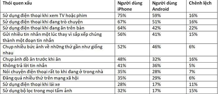 Dưới đây, bạn sẽ thấy một biểu đồ trình bày chi tiết một số phát hiện của nghiên cứu. Cột đầu tiên chứa những thói quen xấu khi dùng điện thoại thông minh. Hai cột tiếp theo cho thấy khả năng người dùng iPhone và người dùng Android thực hiện thói quen xấu đó. Cột cuối cùng là khoảng cách % giữa hai nhóm người dùng. Tỷ lệ phần trăm thấp hơn là tốt hơn.