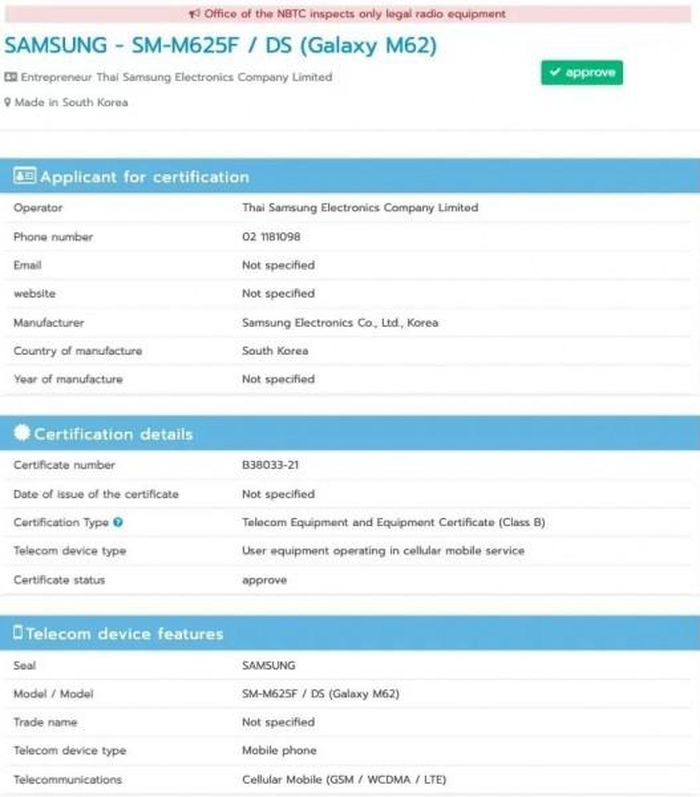 Chúng ta đã nghe về SM-M625F / DS của Samsung trong một thời gian dài gần đây và thiết bị hiện đã được chứng nhận bởi NBTC của Thái Lan, xác nhận tên model Galaxy M62 xuyên suốt quá trình.
