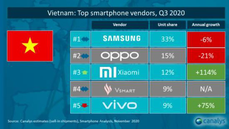Samsung suy giảm nhẹ về doanh số (-6%) nhưng vẫn giữ vững ngôi vị đầu bảng, trong khi Xiaomi vươn lên vị trí thứ ba trong danh sách các thương hiệu điện thoại thông minh hàng đầu tại thị trường Việt Nam trong quý III-2020, theo số liệu do Canalys vừa công bố.