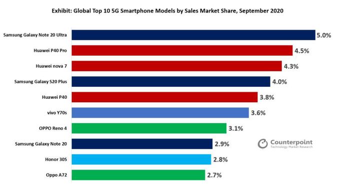 Quý 1 năm 2020, toàn thế giới chỉ có 50 model smartphone 5G. Đến quý 4 năm 2020, con số này khoảng hơn 200 model. Trong số đó, tỷ lệ smartphone 5G giá rẻ ngày càng nhiều. Trong top 10 smartphone 5G bán chạy nhất toàn cầu năm 2020, có khoảng 1/2 là các thiết bị tầm trung và giá rẻ.