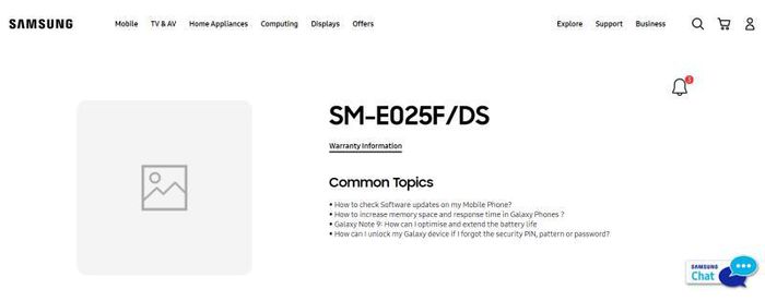 Trang hỗ trợ dành cho điện thoại di động Samsung mới có số model SM-E025F/DS đã xuất hiện trực tuyến trên trang web của Ấn Độ. Từ model ta có thể suy luận được tên của thiết bị. Ví dụ: Galaxy M02s giá rẻ mới ra mắt gần đây ở Ấn Độ có số model SM-M025F. Từ đó ta có thể suy luận được tên của smartphone mới là Samsung Galaxy E02.