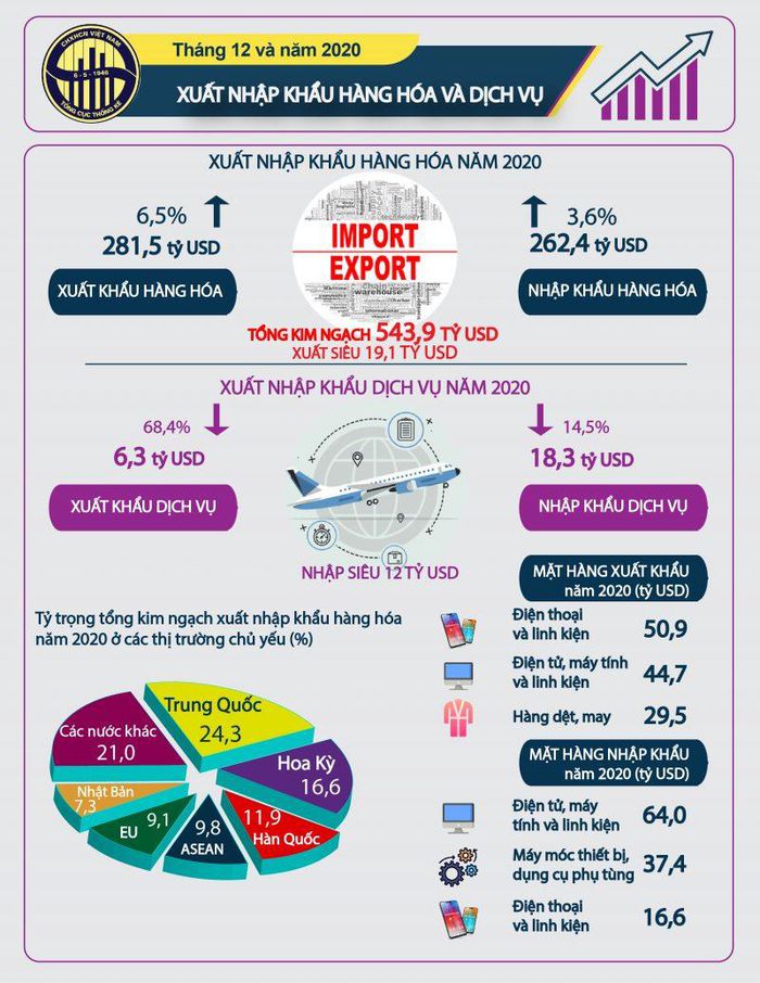 Cán cân thương mại hàng hóa thực hiện tháng 12/2020 nhập siêu 252 triệu USD; năm 2020 xuất siêu 20 tỷ USD. Ước tính tháng 01/2021 xuất siêu 1,3 tỷ USD, trong đó khu vực kinh tế trong nước nhập siêu 1,8 tỷ USD; khu vực có vốn đầu tư nước ngoài (kể cả dầu thô) xuất siêu 3,1 tỷ USD.
