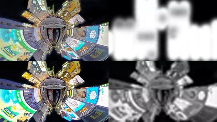 Tấm nền LED thông thường (ảnh trên bên phải) so với tấm nền công nghệ Mini-LED (ảnh dưới bên phải) và kết quả hình ảnh xuất ra có màu sắc khác nhau