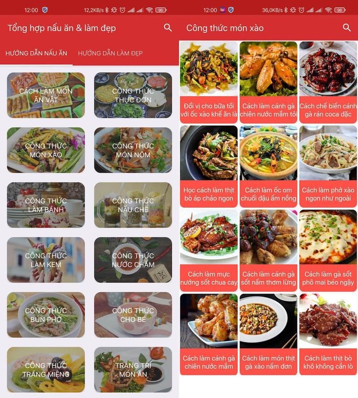 Giao diện của ứng dụng khá đơn giản và đẹp mắt, “mặt tiền” là các mục hướng dẫn cách làm món ăn vặt, công thức món xào, công thức làm bánh, công thức nấu chè… Khi bấm vào một mục bất kỳ, bạn sẽ thấy hàng loạt món ăn liên quan.