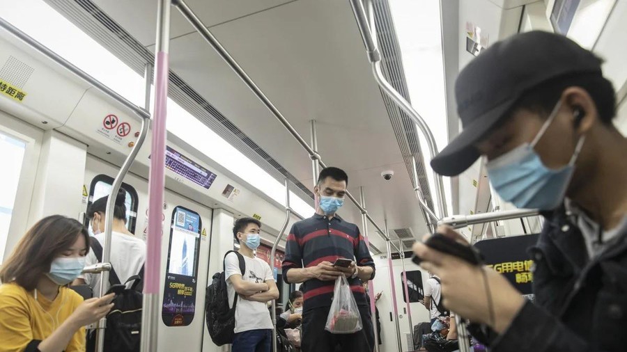 Hành khách sử dụng điện thoại thông minh khi đi tàu điện ngầm ở Vũ Hán ngày 1 tháng 5 (ảnh: Bloomberg)