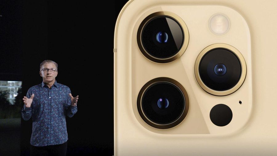 Mẫu iPhone Pro 12 mới được Phó Chủ tịch phụ trách marketing toàn cầu của Apple Greg Joswiak, giới thiệu ngày 13/10/2020. Ảnh: AFP/TTXVN